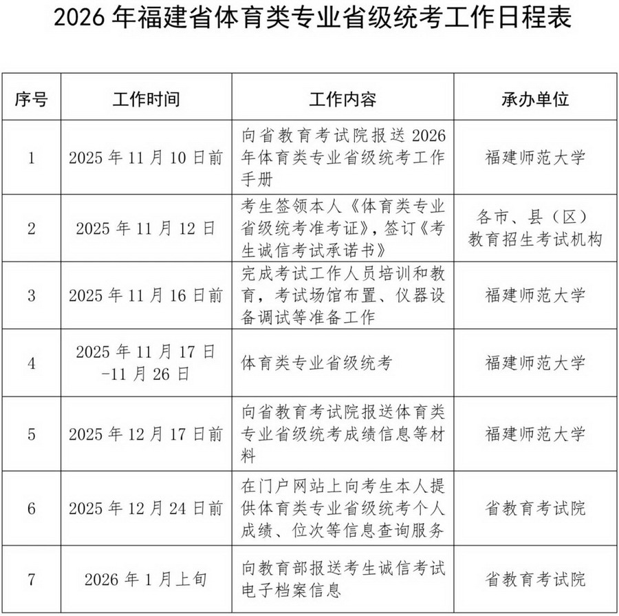 日前,省教育廳印發(fā)《關(guān)于做好2026年普通高校招生體育類專業(yè)省級統(tǒng)一考試工作的通知》,明確2026年福建省普通高校招生體育類專業(yè)省級統(tǒng)一考試(以下簡稱體育類專業(yè)省級統(tǒng)考)將于2025年11月17日-11月26日進(jìn)行。