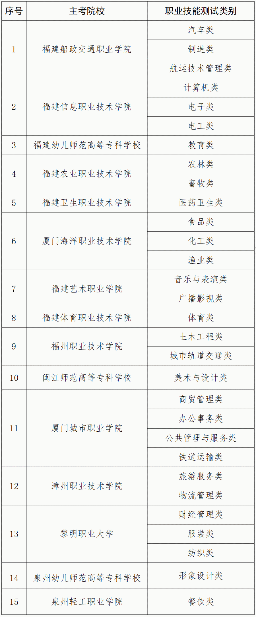 2026年福建省高職院校分類考試招生職業(yè)技能測試主考院校名單